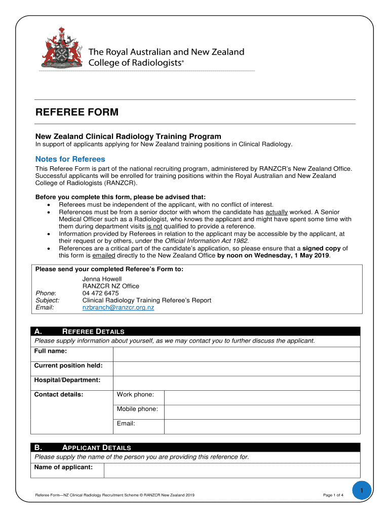 REFEREE FORM New Zealand Clinical Radiology Training Program In support of applicants applying for New Zealand training positions in Clinical Radiology. Notes for Referees This Referee Form is part