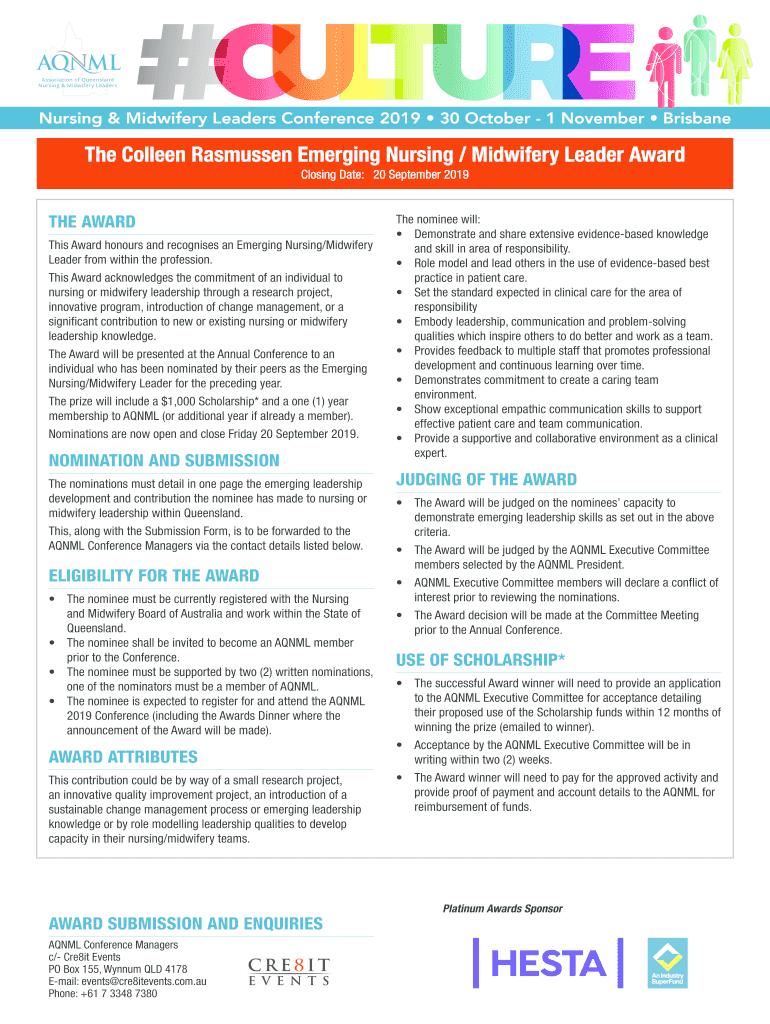 Nursing & Midwifery Leaders Conference 2019 30 October 1 November Brisbane Colleen Rasmussen Emerging Nursing / Midwifery Leader Award Closing Date: 20 September 2019THE AWARD This Award honors and