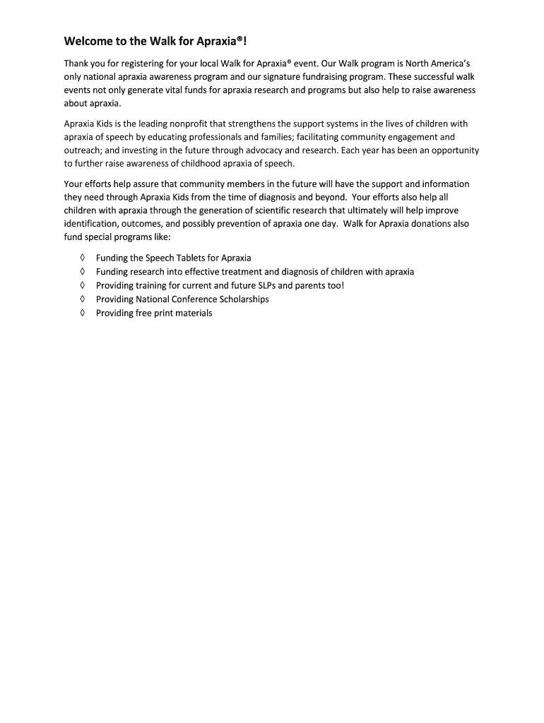 Walk for apraxia is an annual fundraising event organized to raise awareness and funds for apraxia research and support services.