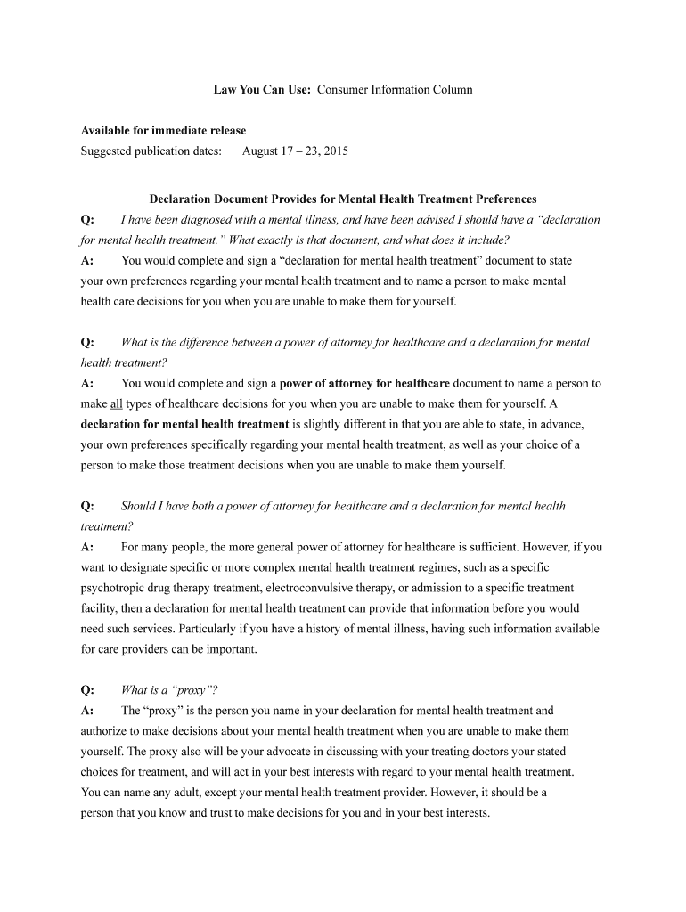 Law You Can Use: Consumer Information Column Available for immediate release Suggested publication dates:August 17 23, 2015Declaration Document Provides for Mental Health Treatment Preferences Q:I