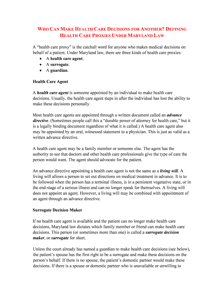 WHO CAN MAKE HEALTH CARE DECISIONS FOR ANOTHER? DEFINING HEALTH CARE PROXIES UNDER MARYLAND LAW A health care proxy is the catchall word for anyone who makes medical decisions on behalf of a patient.
