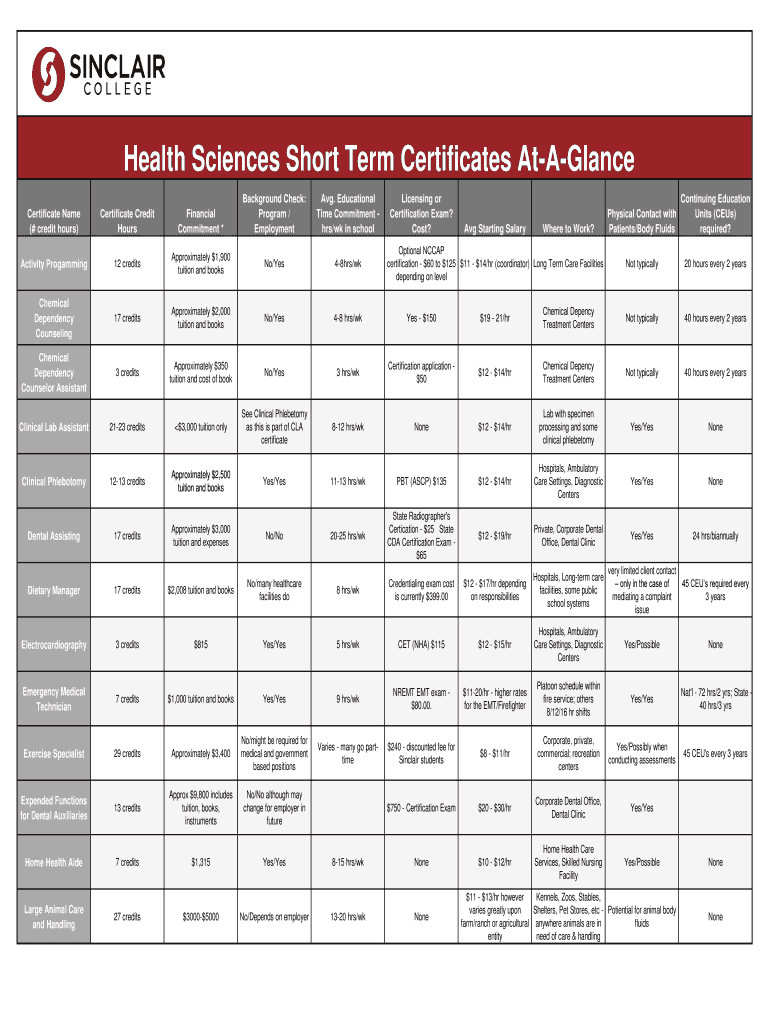 Get the free Health Sciences Short Term Certificates At-A-Glance