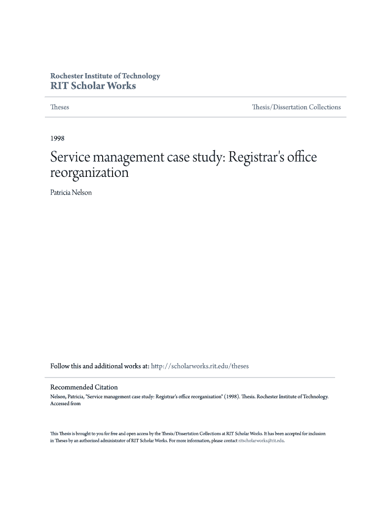 Rochester Institute of Technology Scholar Works ThesesThesis/Dissertation Collections1998Service management case study: Registrar's office reorganization Patricia NelsonFollow this and additional