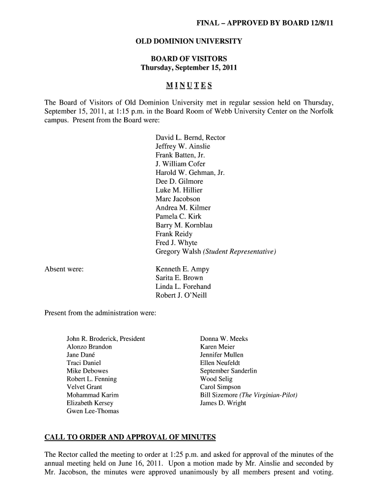 FINAL APPROVED BY BOARD 12/8/11 OLD DOMINION UNIVERSITY BOARD OF VISITORS Thursday, September 15, 2011, MINUTES The Board of Visitors of Old Dominion University met in regular session held on Thursday,