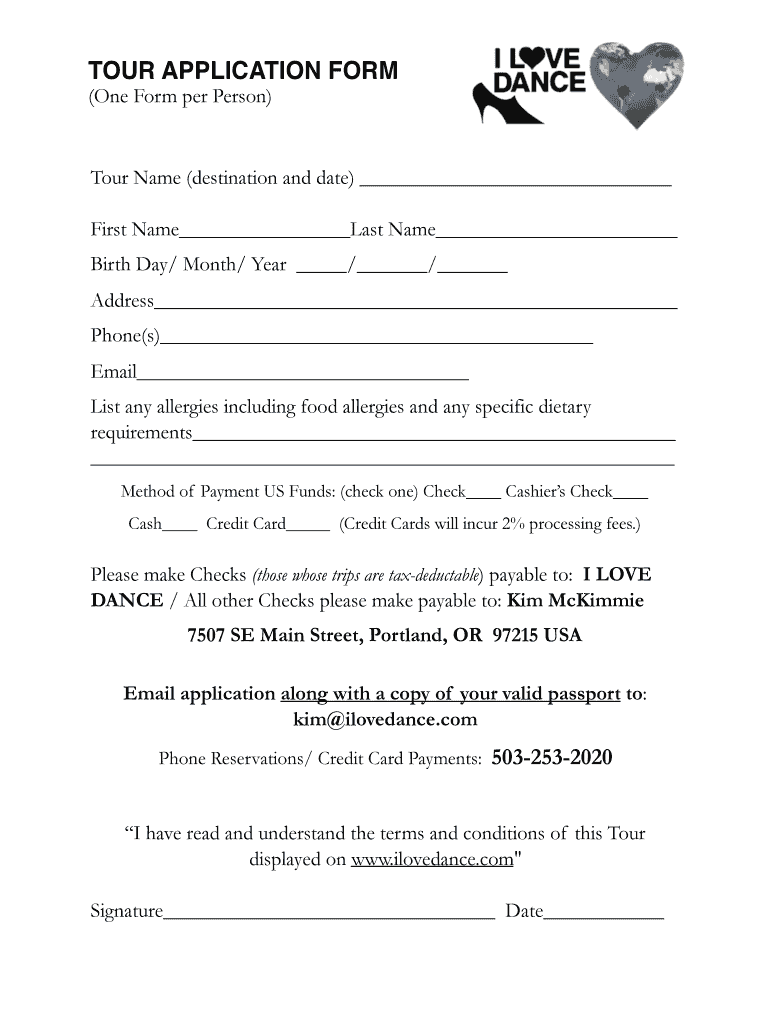 TOUR APPLICATION FORM (One Form per Person)Tour Name (destination and date) First Name Last Name Birth Day/ Month/ Year / / Address Phone(s) Email List any allergies including food allergies and any