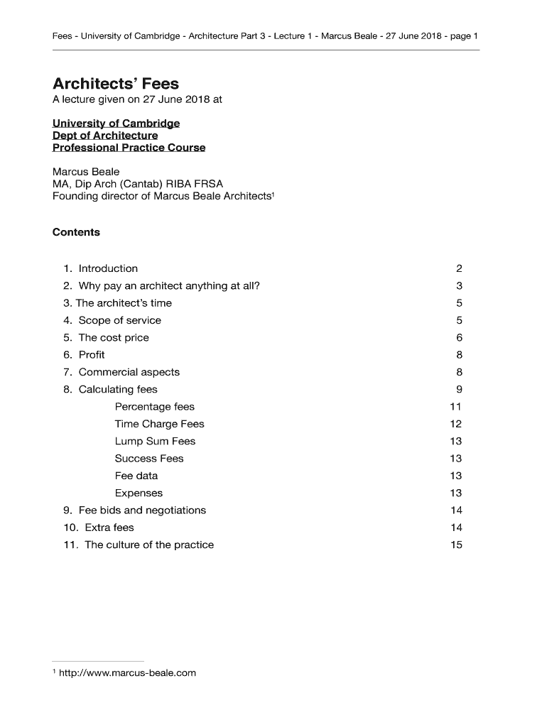 Fees University of Cambridge Architecture Part 3 Lecture 1 Marcus Beale 27 June 2018 page 1 Architects Fees A lecture given on 27 June 2018 at University of Cambridge Dept of Architecture Professional