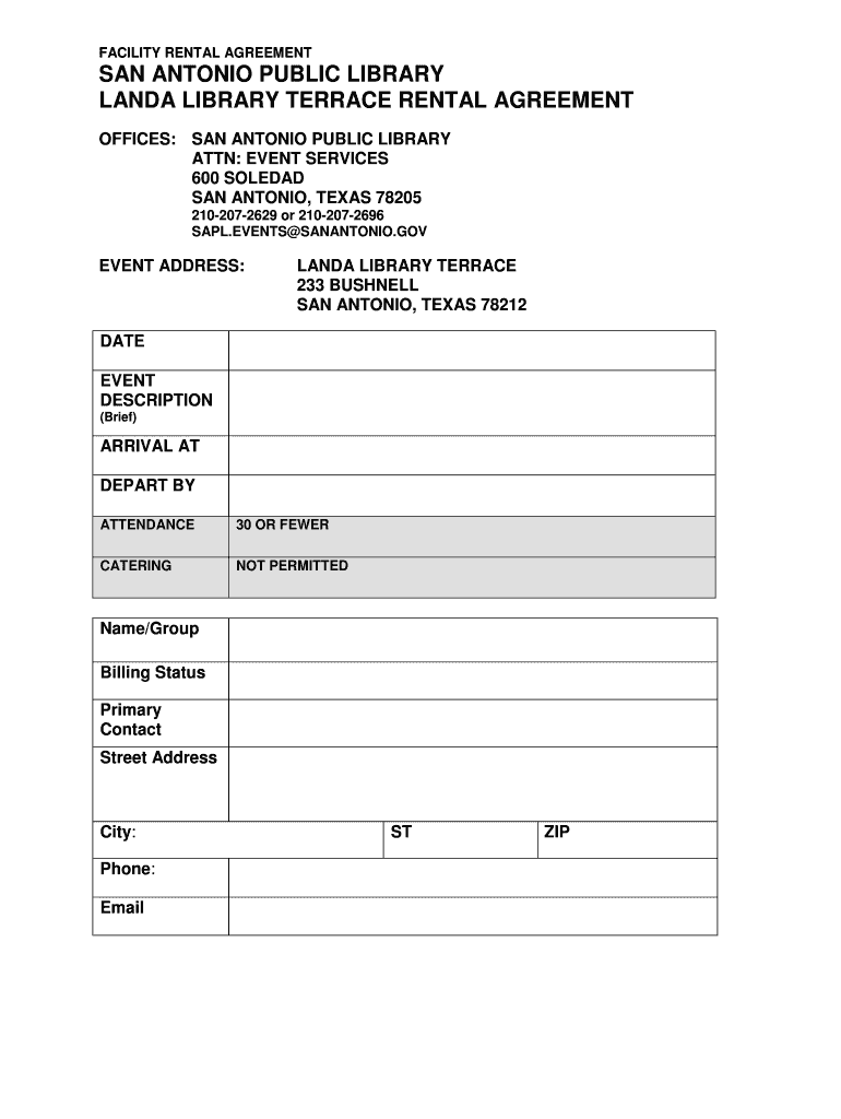 FACILITY RENTAL AGREEMENT SAN ANTONIO PUBLIC LIBRARY LAND LIBRARY TERRACE RENTAL AGREEMENT OFFICES: SAN ANTONIO PUBLIC LIBRARY ATTN: EVENT SERVICES 600 SOLEDAD SAN ANTONIO, TEXAS 78205 2102072629