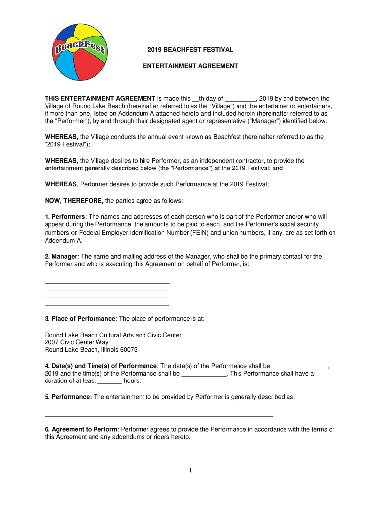 2019 BEACHES FESTIVAL ENTERTAINMENT AGREEMENTS ENTERTAINMENT AGREEMENT is made this TH day of, 2019 by and between the Village of Round Lake Beach (hereinafter referred to as the “Village “) and