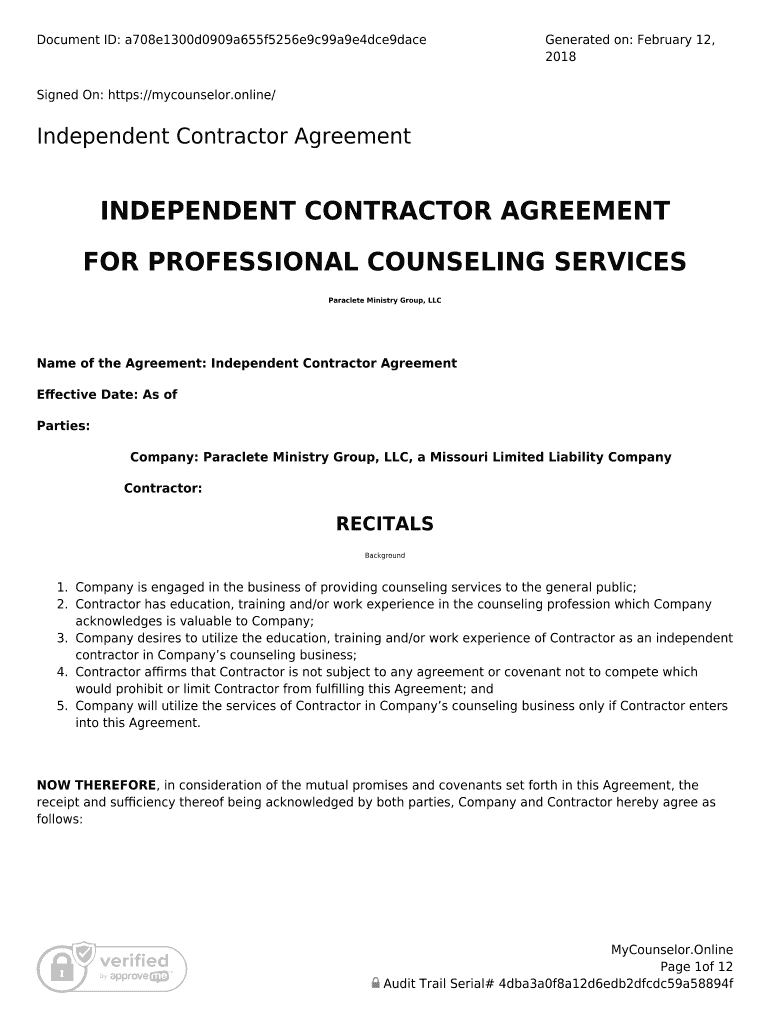 Get the free independent contractor agreement for professional counseling ...
