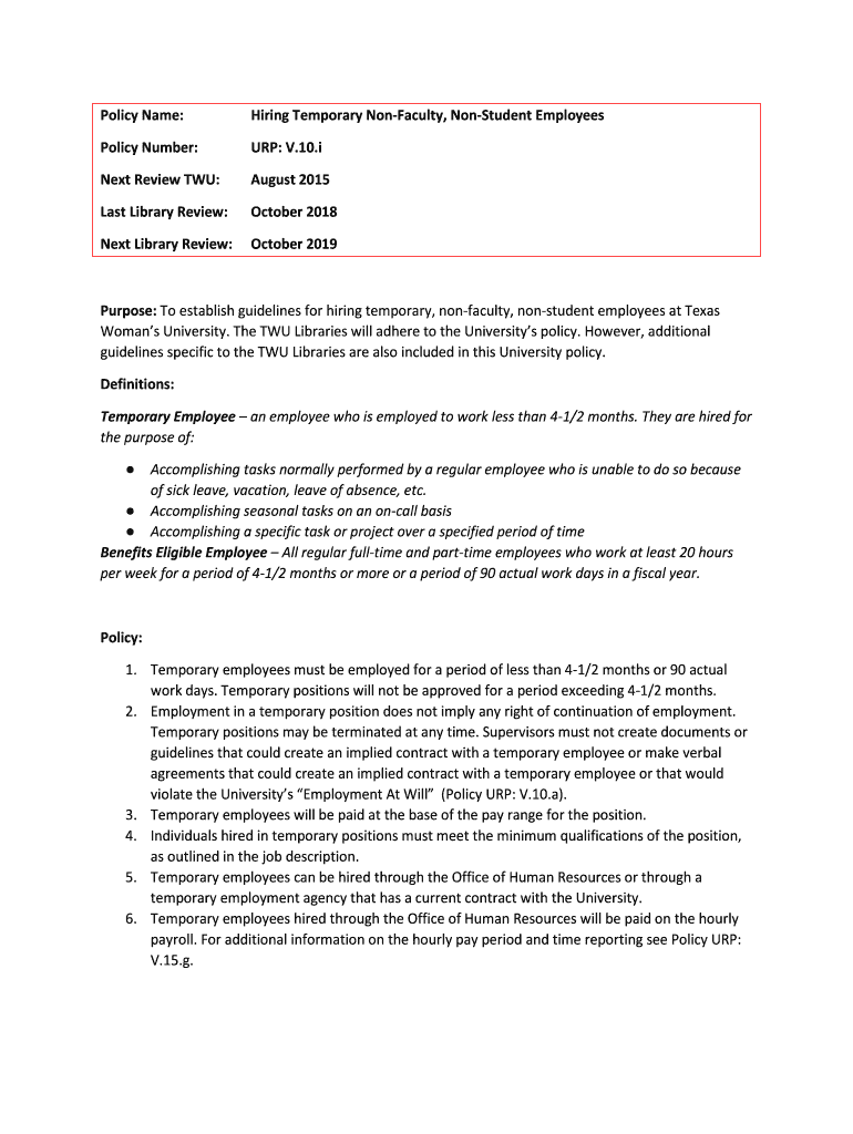 Policy Name:Hiring Temporary Faculty, Student EmployeesPolicy Number:UP: V.10.next Review TWU:August 2015Last Library Review:October 2018Next Library Review:October 2019Purpose: To establish guidelines