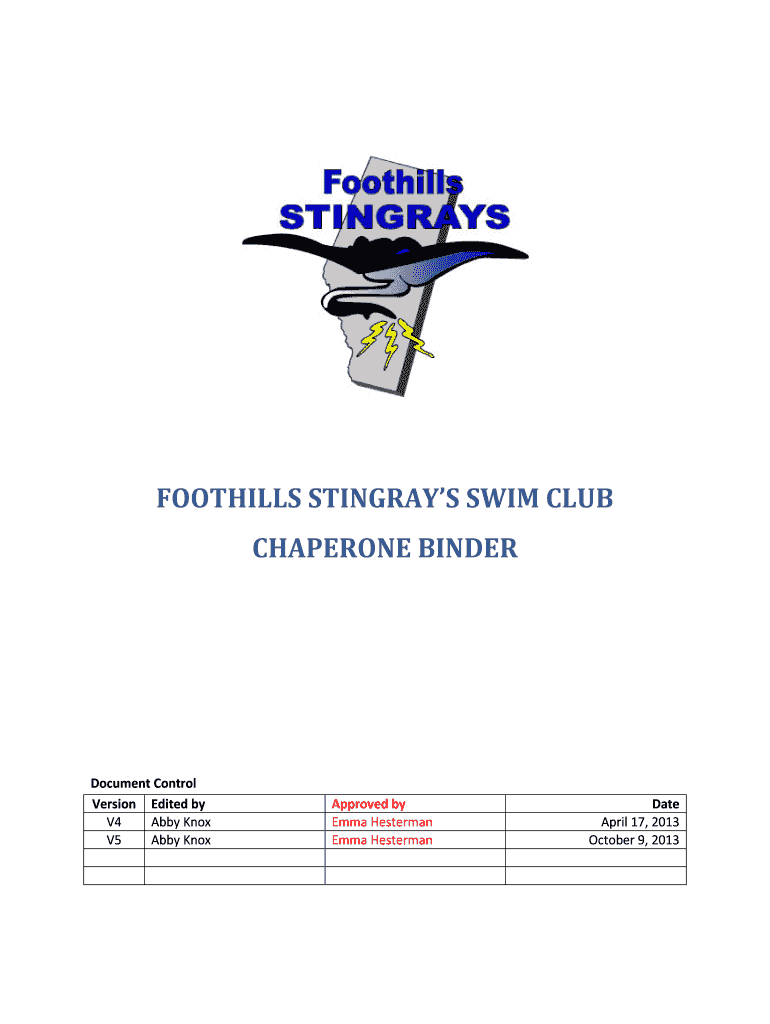 FOOTHILLS STINGRAYS SWIM CLUB CHAPERONE BINDERDocument Control Version Edited by V4 Abby Knox V5 Abby Unapproved by Emma Hester man Emma HestermanDate April 17, 2013, October 9, 2013FSSC CHAPERONE1.