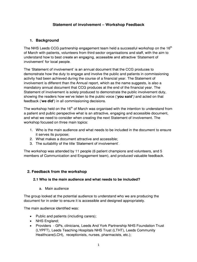 Get the free Statement of involvementWorkshop Feedback 1. Background