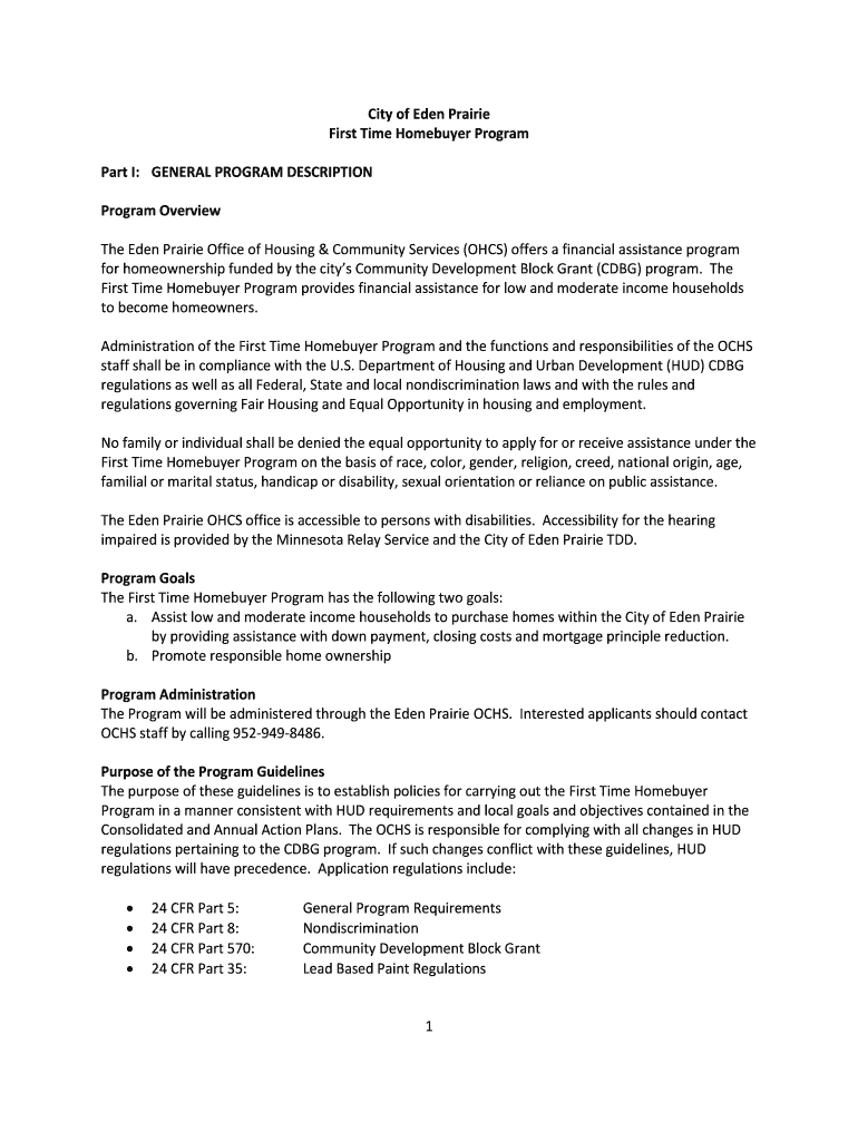 Get the free City of Eden Prairie First Time Homebuyer Program Part I ...