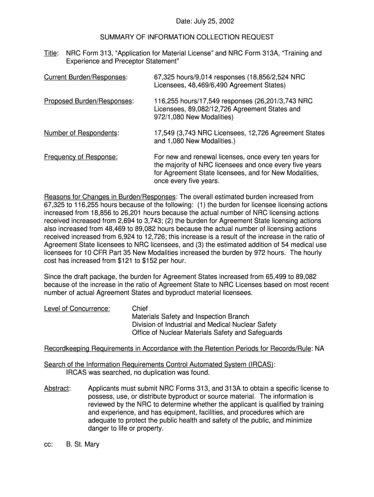 SUMMARY OF INFORMATION COLLECTION REQUEST