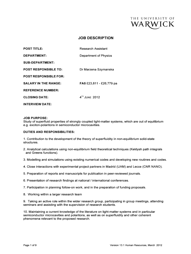 JOB DESCRIPTION POST TITLE:Research AssistantDEPARTMENT:Department of PhysicsSUBDEPARTMENT: POST RESPONSIBLE TO:Dr Arena SzymanskaPOST RESPONSIBLE FOR: SALARY IN THE RANGE:FA5 23,811 26,779 preference