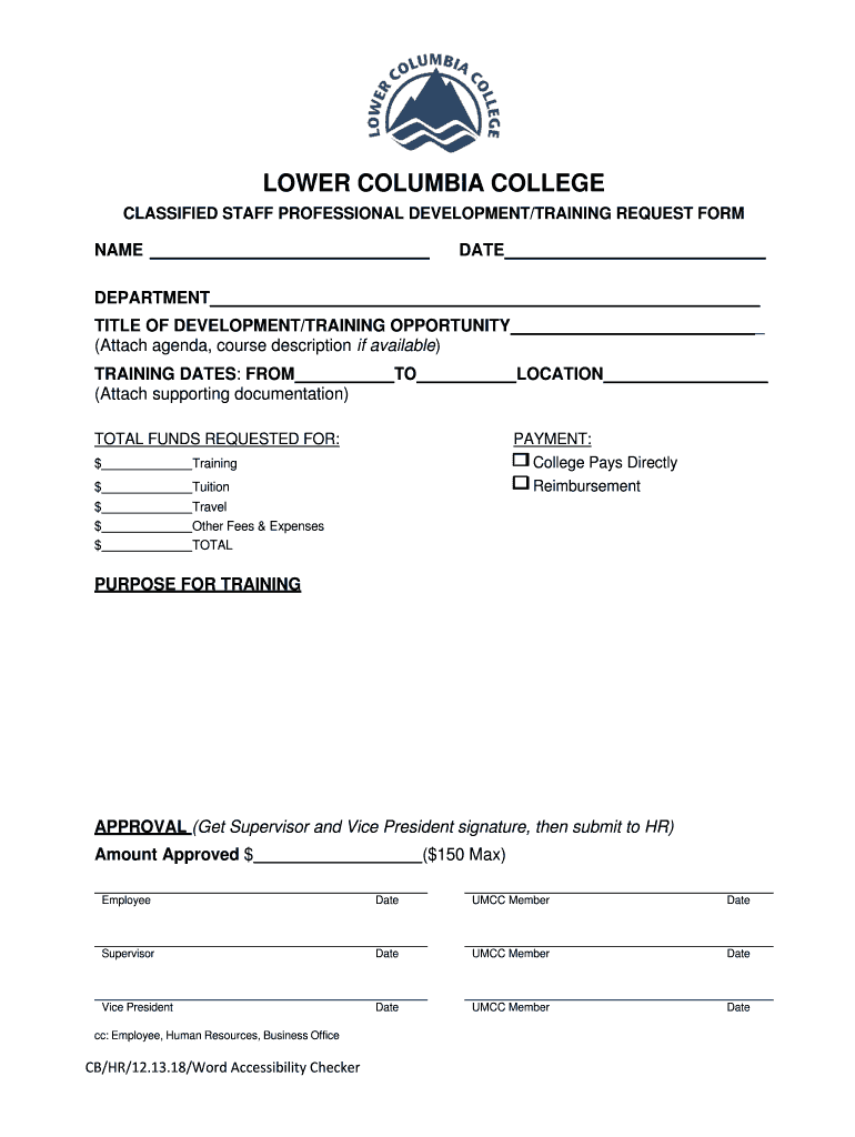 LOWER COLUMBIA COLLEGE CLASSIFIED STAFF PROFESSIONAL DEVELOPMENT/TRAINING REQUEST FORENAME DATEDEPARTMENT TITLE OF DEVELOPMENT/TRAINING OPPORTUNITY (Attach agenda, course description if available)
