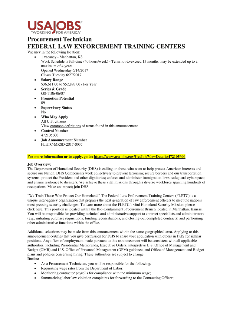 Procurement Technician FEDERAL LAW ENFORCEMENT TRAINING CENTERS Vacancy in the following location: 1 vacancy Manhattan, KS Work Schedule is full time (40 hours/week) Term nottoexceed 13 months, may