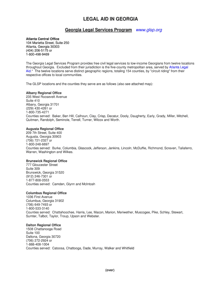LEGAL AID IN GEORGIA Legal Services Program www.glsp.org Atlanta Central Office 104 Marietta Street, Suite 250 Atlanta, Georgia 30303 (404) 2065175 or 18004989469 The Georgia Legal Services Program