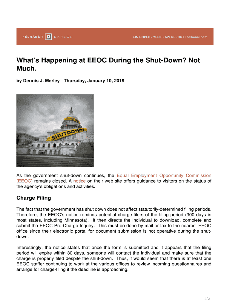 What's Happening at EEOC During the ShutDown? Not Much. By Dennis J. Merely Thursday, January 10, 2019As the government shutdown continues, the Equal Employment Opportunity Commission (EEOC) remains