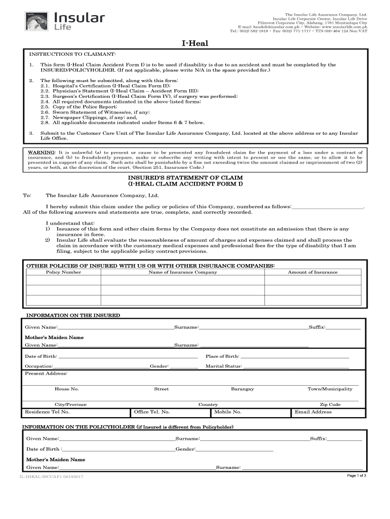 The Insular Life Assurance Company, Ltd. Insular Life Corporate Center, Insular Life Drive The Finest Corporate City, Ala bang, 1781 Muntinlupa City Email: head insular.com.pH Website: www.insularlife.com.ph