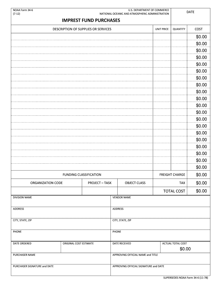 NOAA Form 346 (712)U.S. DEPARTMENT OF COMMERCE NATIONAL OCEANIC AND ATMOSPHERIC ADMINISTRATIONDATEIMPREST FUND PURCHASES DESCRIPTION OF SUPPLIES OR SERVICES UNIT PRICEQUANTITYCOST×0.00×0.00 ×0.00