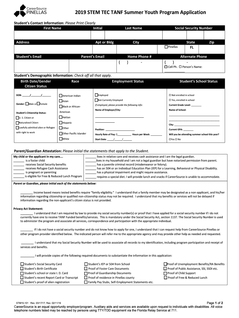 2019 STEM TEC TANK Summer Youth Program Application Students Contact Information: Please Print Clearly First Name Initial Addresses Name or Biosocial Security NumberCityState FL PinellasStudents EmailParents