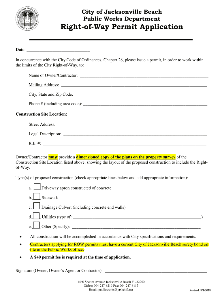 City of Jacksonville Beach Public Works DepartmentRightofWay Permit Application Date: In concurrence with the City Code of Ordinances, Chapter 28, please issue a permit, in order to work within the