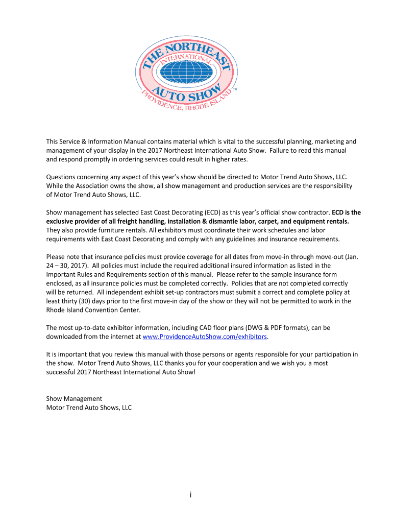 This Service & Information Manual contains material which is vital to the successful planning, marketing and management of your display in the 2017 Northeast International Auto Show. Failure to read