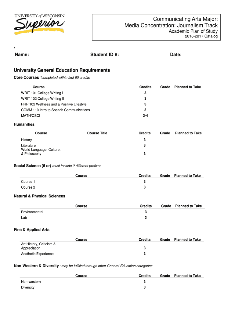 Communicating Arts Major: Media Concentration: Journalism Track Academic Plan of Study 20162017 Catalog Name: Student ID #: Date: University General Education Requirements Core Courses *completed