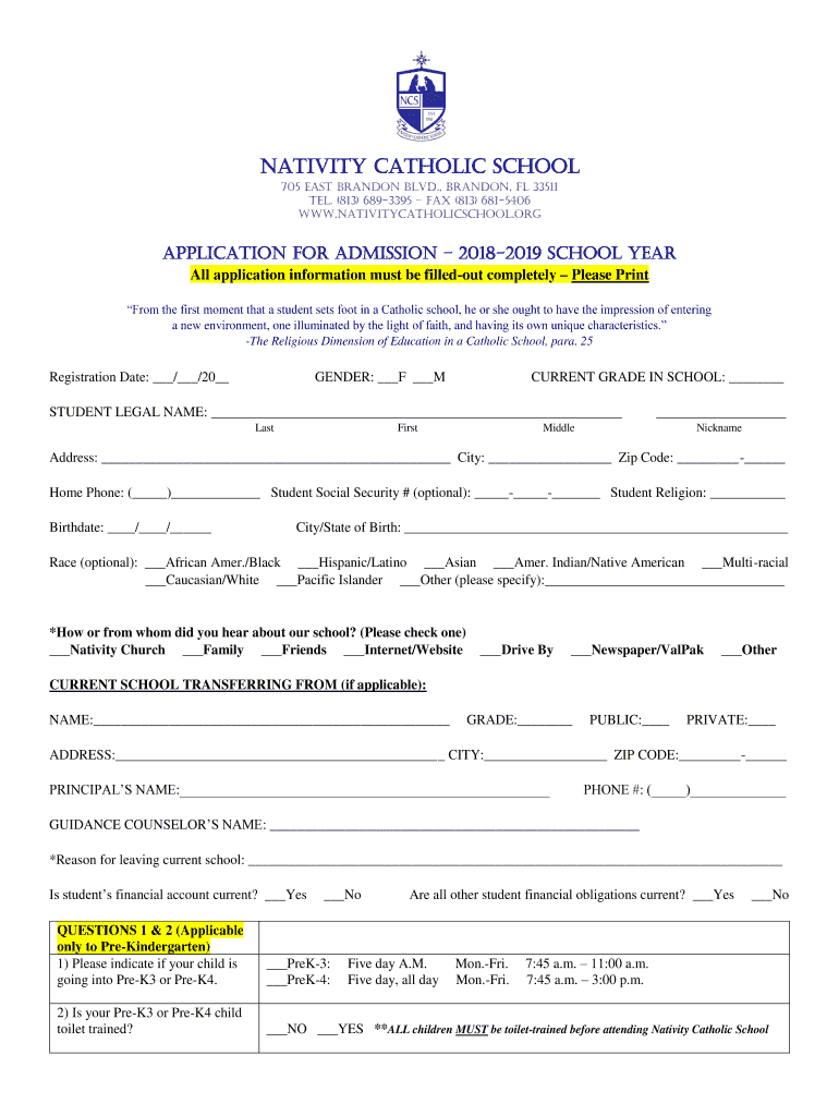 Nativity catholic school 705 east Brandon blvd., Brandon, fl 33511 Tells. (813) 6893395 Fax (813) 6815406 www.nativitycatholicschool.orgapplication for admission 20182019 school year All application