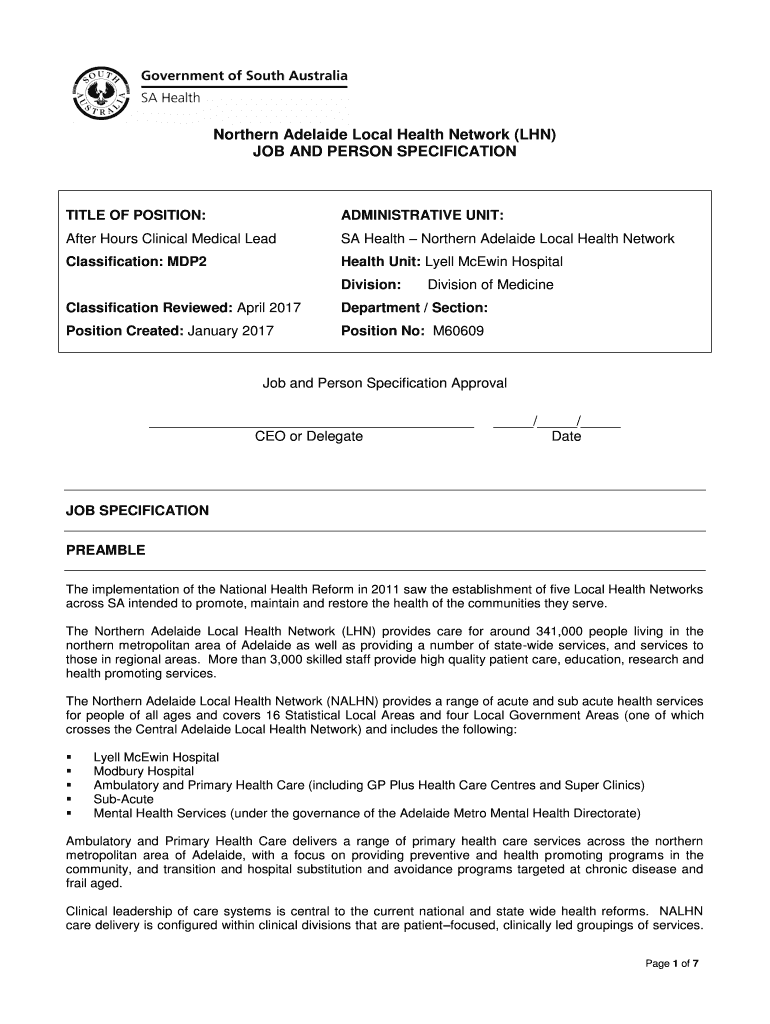 Northern Adelaide Local Health Network (LIN) JOB AND PERSON SPECIFICATIONTITLE OF POSITION:ADMINISTRATIVE UNIT:After Hours Clinical Medical Leads Health Northern Adelaide Local Health NetworkClassification: