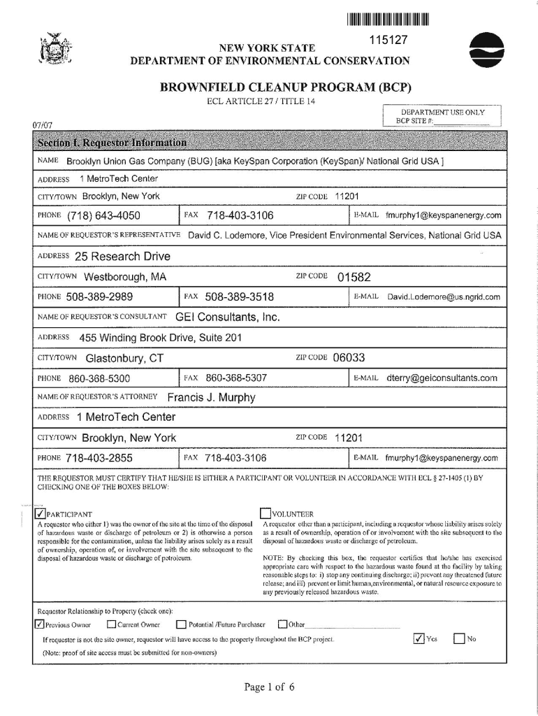 *115127* 115127NEW YORK STATE DEPARTMENT OF ENVIRONMENTAL CONSERVATIONBROWNFIELD CLEANUP PROGRAM (BCP) Eel ARTICLE 271 TITLE 14NAMEBrooklyn Union Gas Company (BUG) aka Key Span Corporation (Key Span)l