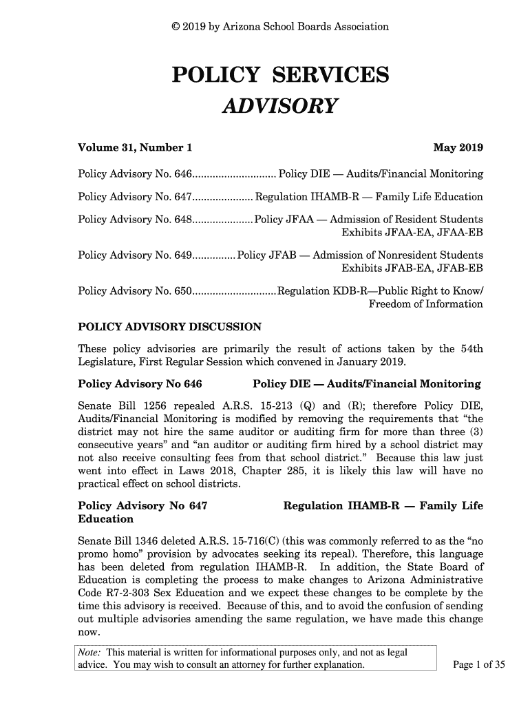 2019 by Arizona School Boards AssociationPOLICY SERVICES ADVISORY Volume 31, Number 1May 2019Policy Advisory No. 646............................. Policy DIE Audits/Financial Monitoring Policy Advisory