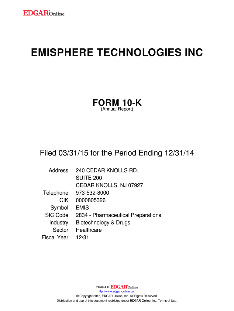 Get the free EMISPHERE TECHNOLOGIES INC. FORM 10-K (Annual Report) Filed 03/31/15 for the Period ...