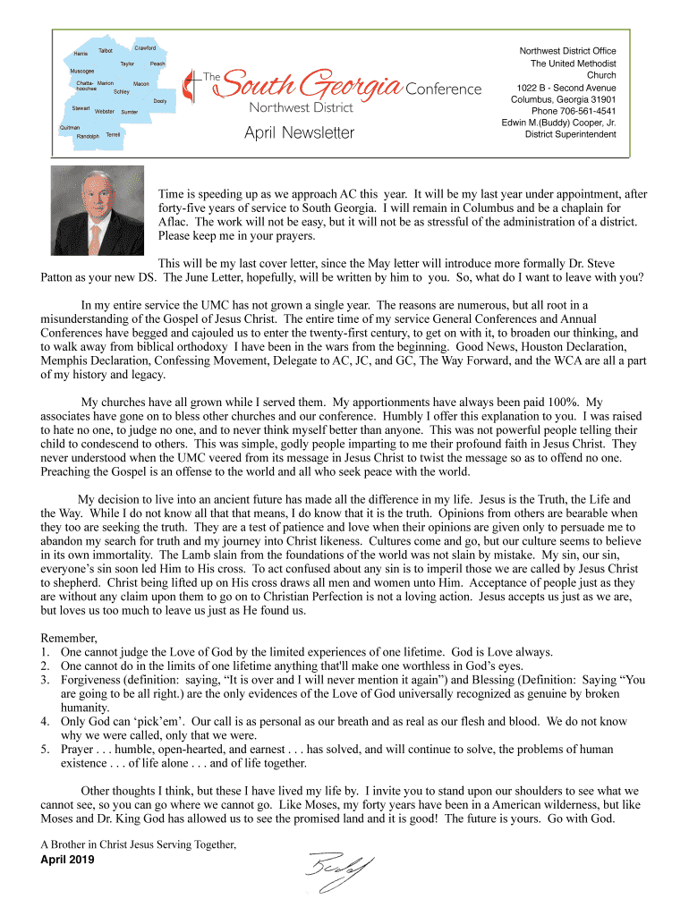 April Newsletter Northwest District Office The United Methodist Church 1022 B Second Avenue Columbus, Georgia 31901 Phone 7065614541 Edwin M.(Buddy) Cooper, Jr. District SuperintendentTime is speeding