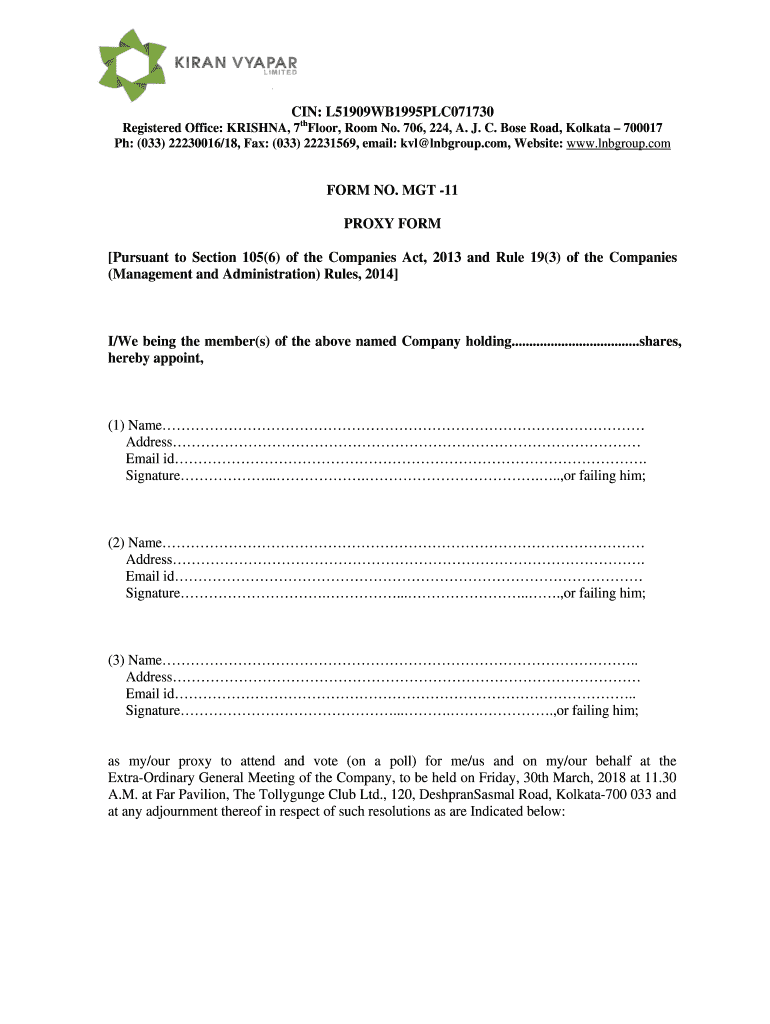 Get the free CIN: L51909WB1995PLC071730 FORM NO. MGT -11 ...