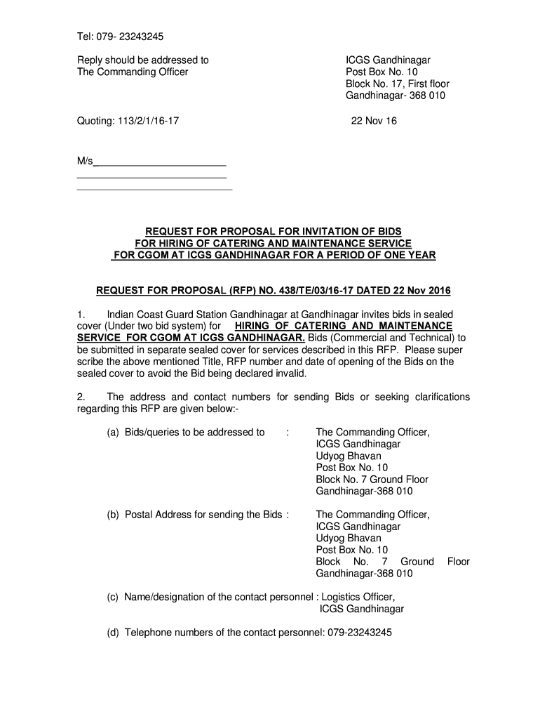 Tel: 079 23243245 Replies should be addressed to The Commanding Officers Gandhinagar Post Box No. 10 Block No. 17, First floor Gandhinagar 368 010Quoting: 113/2/1/161722 Nov 16M/s REQUEST FOR PROPOSAL