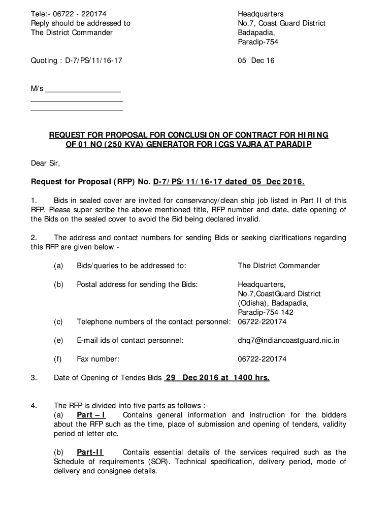 Tell: 06722 220174 Replies should be addressed to The District CommanderHeadquarters No.7, Coast Guard District Badapadia, Paradip754Quoting : D7/PS/11/161705 Dec 16M/s REQUEST FOR PROPOSAL FOR CONCLUSION