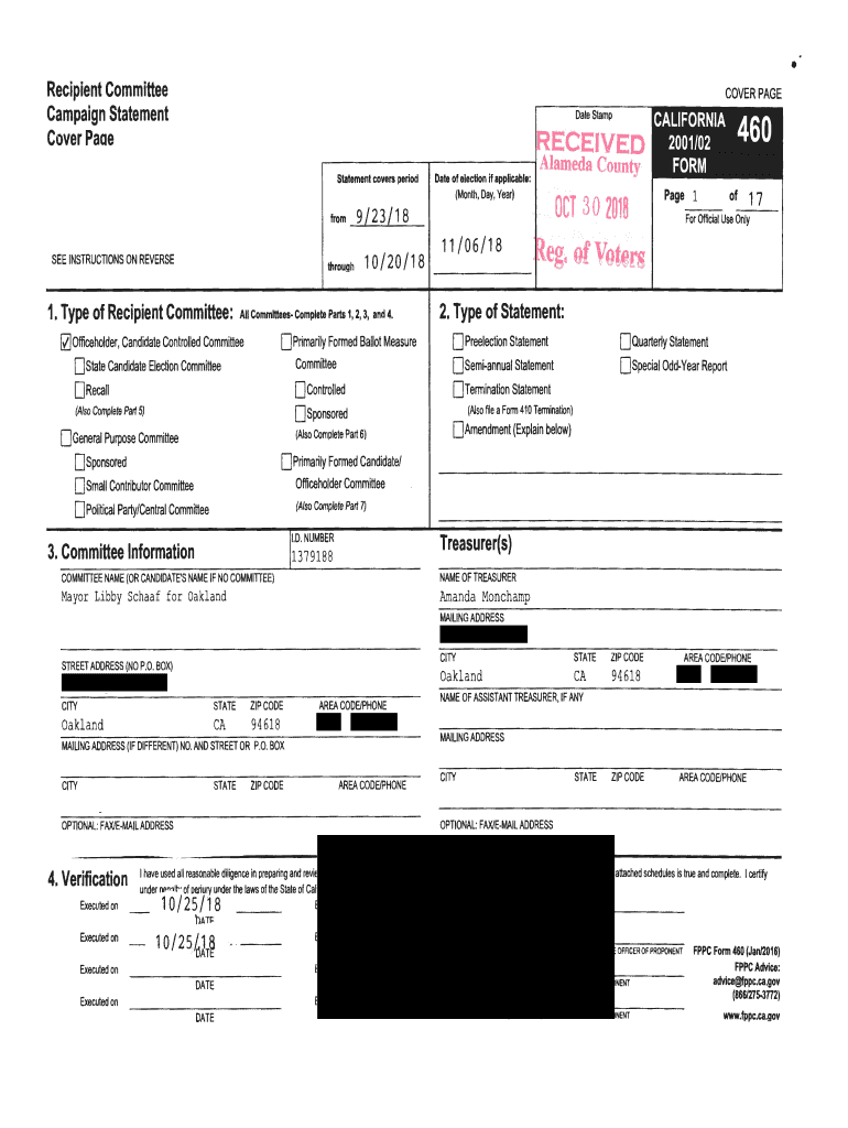 Recipient Committee Campaign Statement CoverPaaeCOVER PAGE Date StampECEIVED, i Alameda Statement covers periodfromSEE INSTRUCTIONS ON REVERSE10/20/18AIICommitteesCompleteParts1,2,3, and 4. D Primarily