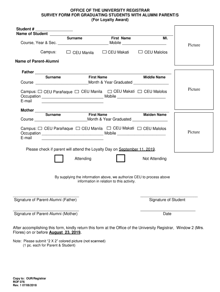 OFFICE OF THE UNIVERSITY REGISTRAR SURVEY FORM FOR GRADUATING STUDENTS WITH ALUMNI PARENT/S (For Loyalty Award) Student # Name of Student SurnameFirst Name MI. Course, Year & Sec. Mobile Campus:CEU