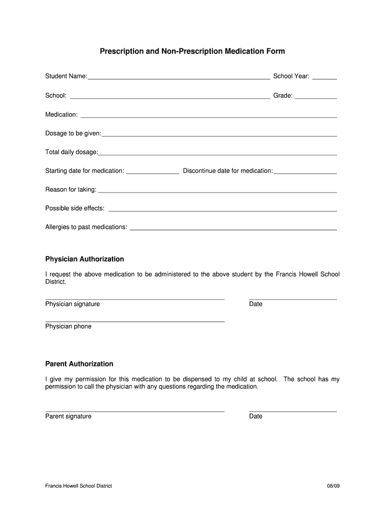 Prescription and Nonprescription Medication Form Student Name: School Year: School: Grade: Medication: Dosage to be given: Total daily dosage: Starting date for medication: Discontinue date for medication:
