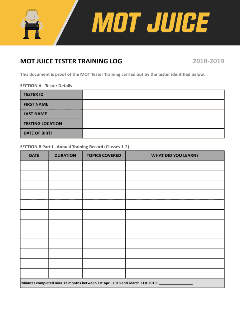 MOT JUICE TESTER TRAINING LOG20182019This document is proof of the MOT Tester Training carried out by the tester denied below. SECTION A Tester Details TESTER ID FIRST NAME LAST NAME TESTING LOCATION