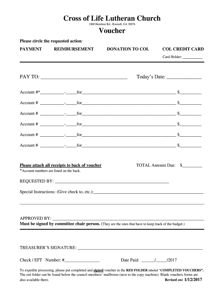 Cross of Life Lutheran Church 1000 Hebrew Rd., Roswell, GA 30076Voucher Please circle the requested action: PAYMENTREIMBURSEMENTDONATION TO COL CREDIT CARD cardholder: PAY TO: Today's Date: Account