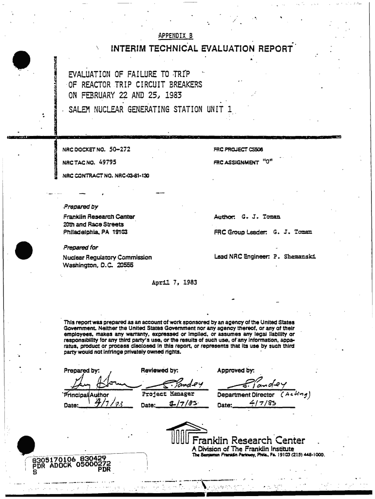 .:./APPENDIX B.INTERIM TECHNICAL EVALUATION REPORTEVALUATION OF FAILURE TO Trip OF REACTOR TRIP CIRCUIT BREAKERS ON FEBRUARY 2i AND 25J 1983 SALEM NUCLEAR GENERATING STATION UNIT 1NRCCOCJCETNO.50272FRC