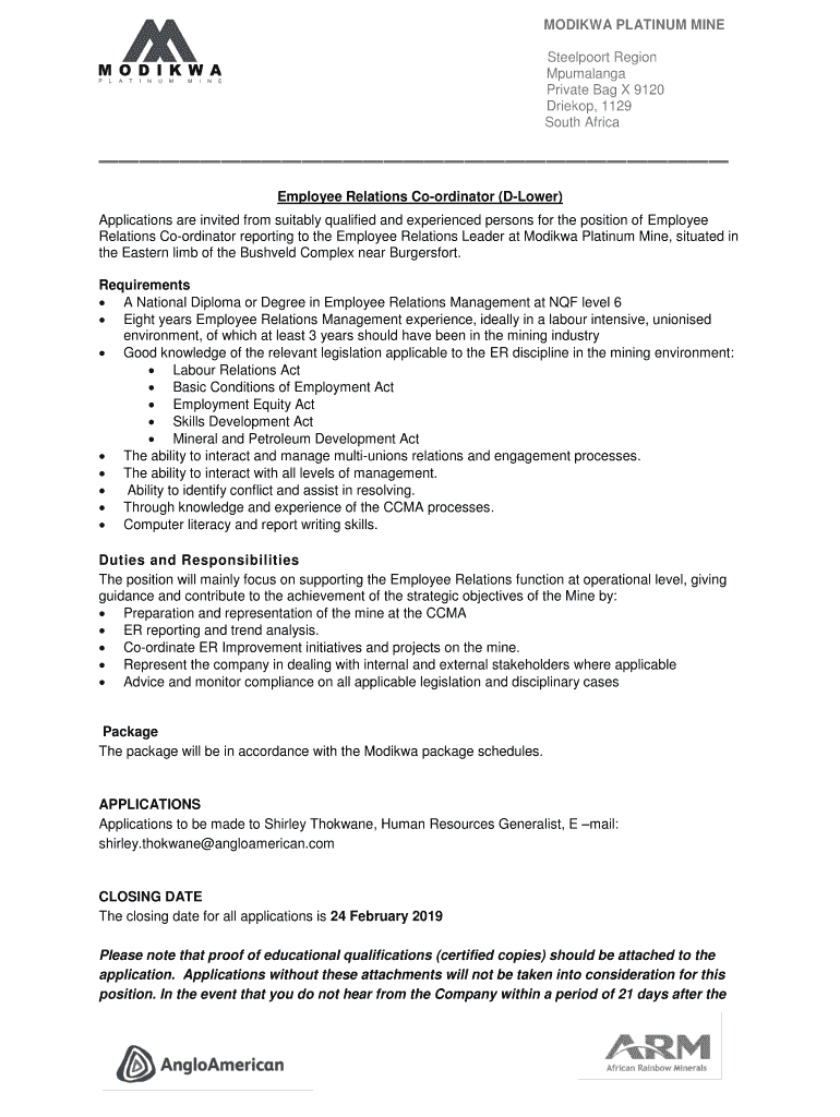 This document is a job advertisement for the position of Employee Relations Co-ordinator at Modikwa Platinum Mine, detailing the requirements, duties, responsibilities, application process, and closing