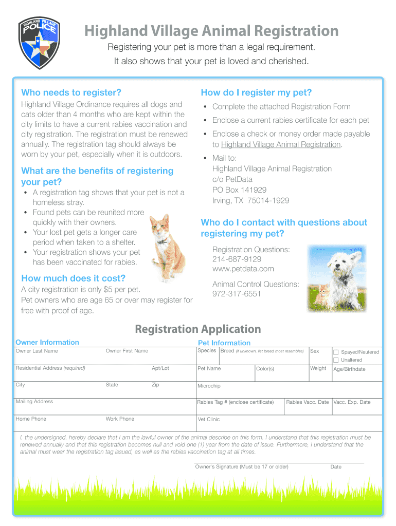 Any pet owner in Highland Village, Texas, who has a dog or cat over 4 months old can register their pets using this form.