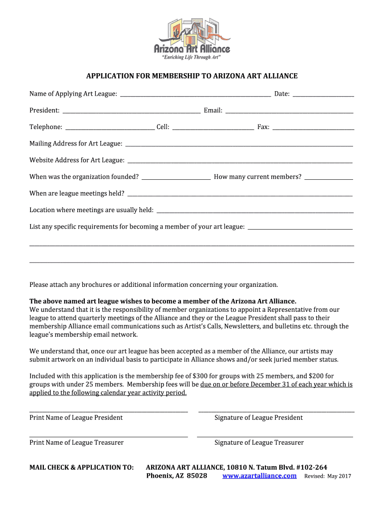 APPLICATION FOR MEMBERSHIP TO ARIZONA ART ALLIANCE Name of Applying Art League: Date: President: Email: Telephone: Cell: Fax: Mailing Address for Art League: Website Address for Art League: When was