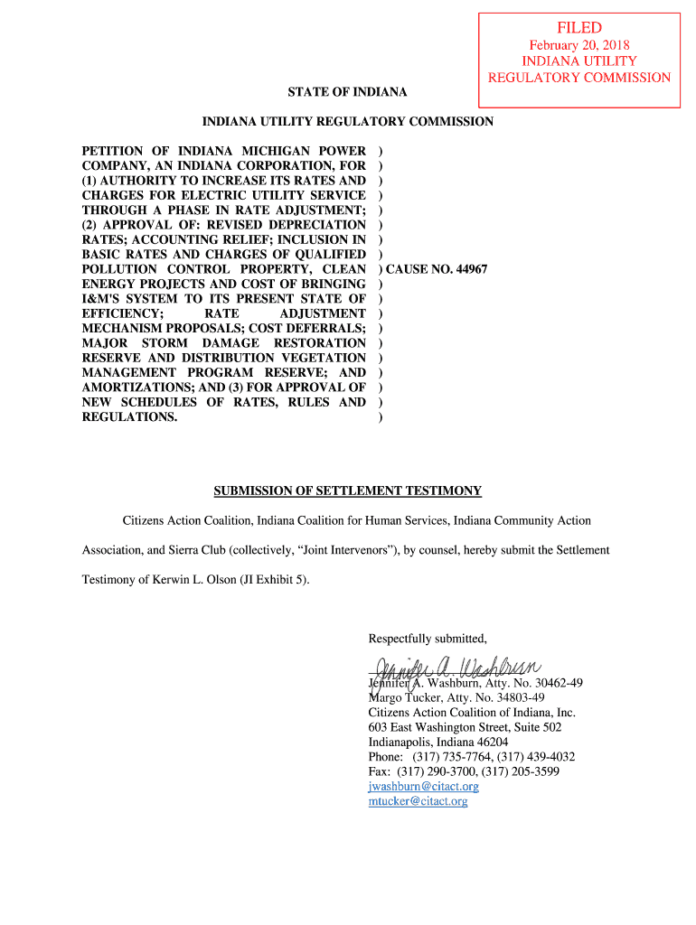 FILED February 20, 2018, INDIANA UTILITY REGULATORY COMMISSION STATE OF INDIANA UTILITY REGULATORY COMMISSION PETITION OF INDIANA MICHIGAN POWER COMPANY, AN INDIANA CORPORATION, FOR (1) AUTHORITY
