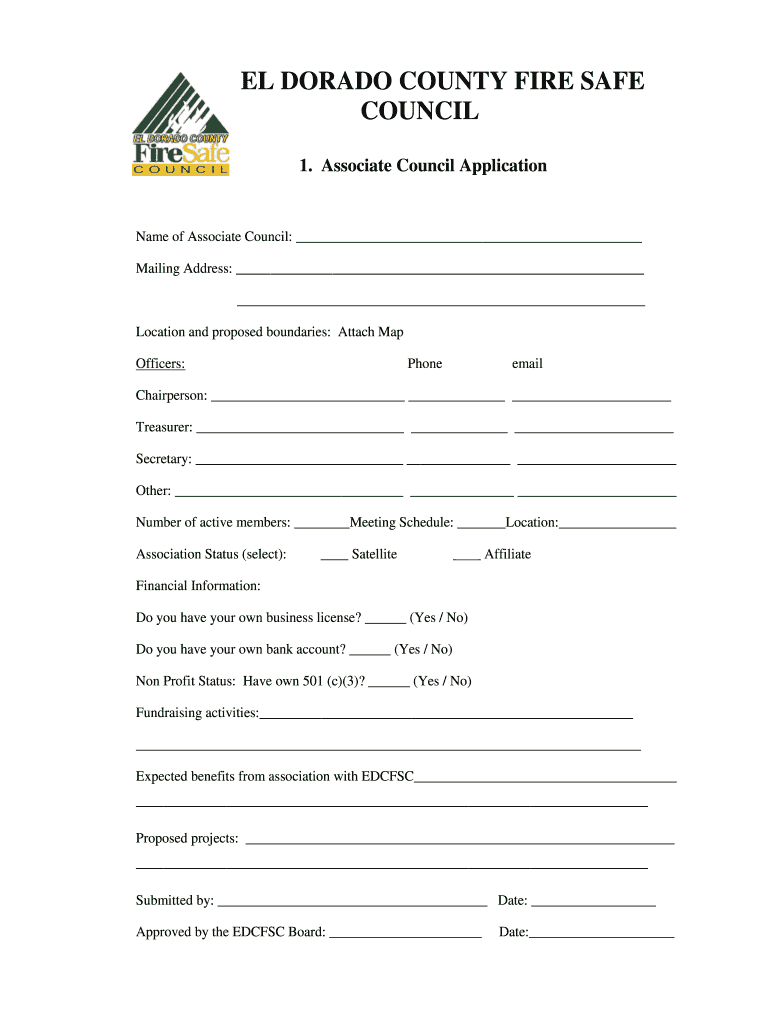 EL DORADO COUNTY FIRE SAFE COUNCIL 1. Associate Council ApplicationName of Associate Council: Mailing Address: Location and proposed boundaries: Attach Map Officers:PhoneemailChairperson: Treasurer: