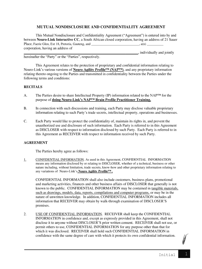 MUTUAL NONDISCLOSURE AND CONFIDENTIALITY AGREEMENT This Mutual Nondisclosure and Confidentiality Agreement (Agreement) is entered into by and between Neuralink Interactive CC, a South African closed